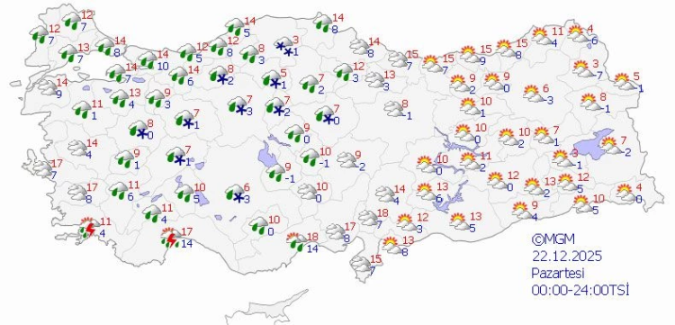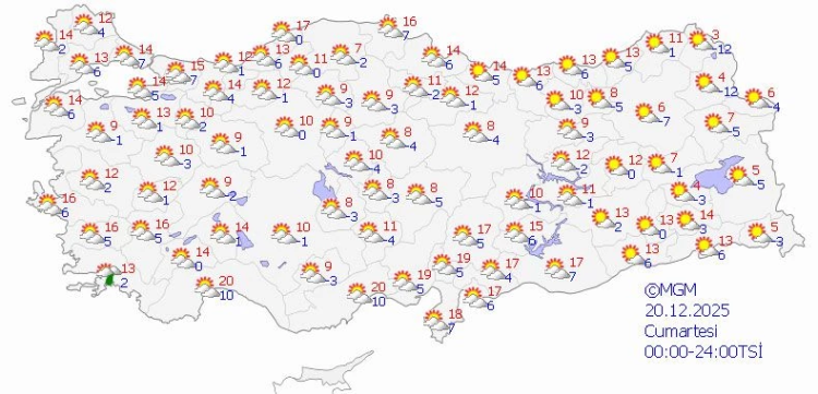 Meteoroloji 20 Aralık 2025 hava durumu raporunu yayımladı. İç Anadolu'da 20 il için kar yağışı Marmara ve Ege'de 30 il için kuvvetli sağanak yağış bekleniyor. Doğu ve Güneydoğu'da ise yer yer sağanak yüksek kesimlerde kar yağışı bekleniyor.
