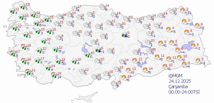 Meteoroloji Genel Müdürlüğü tarafından yapılan tahminlere göre: Ülkemiz genelinde önümüzdeki 24 saat yağış beklenmiyor. Ülkemizin batı ve güney kesimlerinin yer yer çok bulutlu, diğer yerlerin parçalı ve az bulutlu geçeceği tahmin ediliyor. Kuzey, iç ve doğu kesimlerde buzlanma ve don olayı ile birlikte pus, yer yer sis bekleniyor.