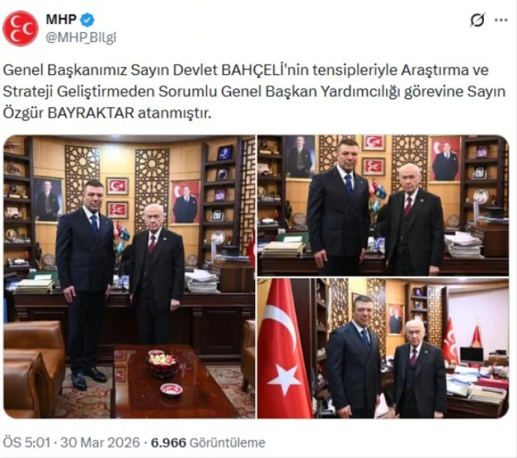MHP'de geçtiğimiz günlerde patlak veren "ajan" polemiği istifa getirdi. Önce zehir zemberek paylaşım yapan MHP Genel Başkan Yardımcısı İzzet Ulvi Yönter ardından istifa etti. Yönter'in istifasının ardından MHP'de yeni atama gerçekleşti. MHP Genel Başkanı Devlet Bahçeli, Özgür Bayraktar'ı Araştırma ve Strateji Geliştirmeden Sorumlu Genel Başkan Yardımcısı olarak atandı.