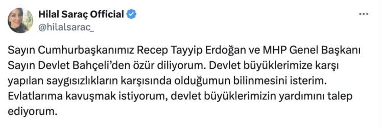 Yardım talep eden Saraç, "Sayın Cumhurbaşkanımız Recep Tayyip Erdoğan ve MHP Genel Başkanı Sayın Devlet Bahçeli’den özür diliyorum. Devlet büyüklerimize karşı yapılan saygısızlıkların karşısında olduğumun bilinmesini isterim. Evlatlarıma kavuşmak istiyorum, devlet büyüklerimizin yardımını talep ediyorum." dedi.