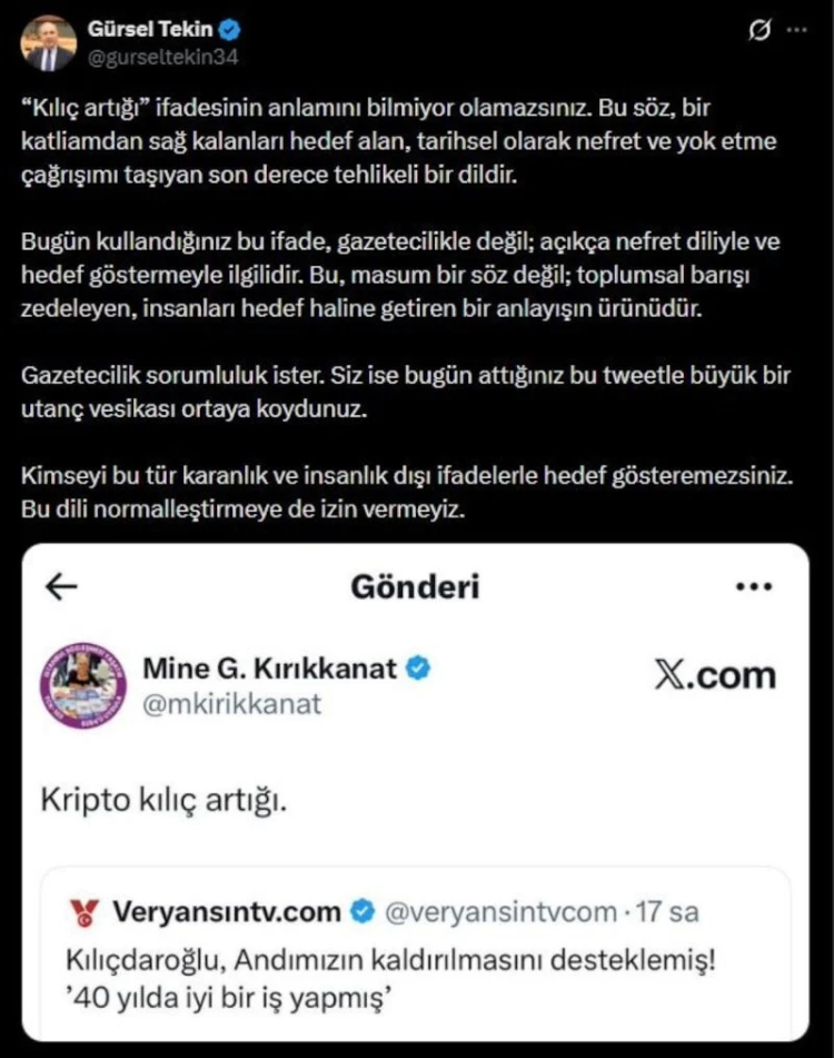 CHP'nin eski İstanbul milletvekili Gürsel Tekin de tartışmaya ortak olarak, Mine Kırıkkanat'ın paylaşımının kasıtlı olduğu imasında bulunarak, "“Kılıç artığı” ifadesinin anlamını bilmiyor olamazsınız. Bu söz, bir katliamdan sağ kalanları hedef alan, tarihsel olarak nefret ve yok etme çağrışımı taşıyan son derece tehlikeli bir dildir." dedi.