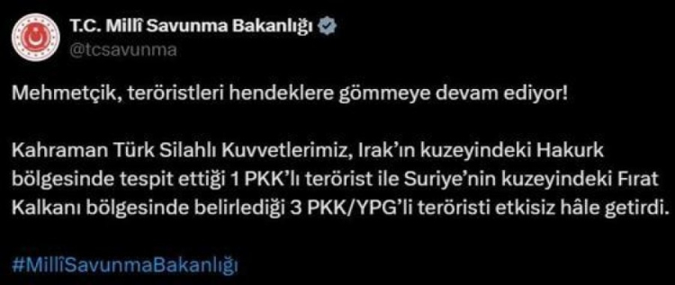 MSB tarafından "Mehmetçik, teröristleri hendeklere gömmeye devam ediyor!" yapılan açıklamada, "Kahraman Türk Silahlı Kuvvetlerimiz, Irak'ın kuzeyindeki Hakurk bölgesinde tespit ettiği 1 PKK'lı terörist ile Suriye'nin kuzeyindeki Fırat Kalkanı bölgesinde belirlediği 3 PKK/YPG'li teröristi etkisiz hâle getirdi." denildi.