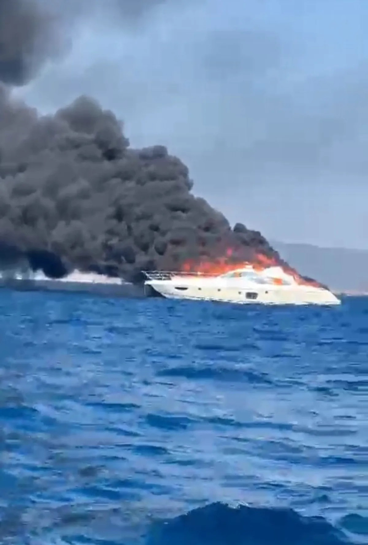 Bodrum ilçesi Türkbükü açıklarında demirli lüks yat, çıkan yangında alev alev yandı.