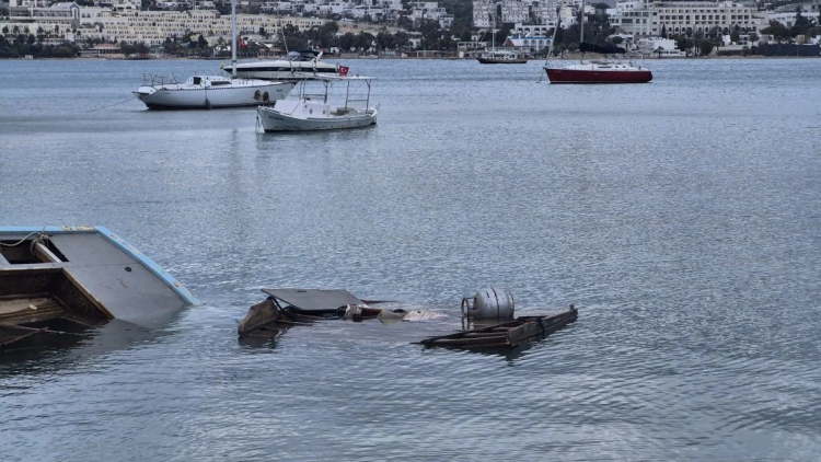 Bodrum ilçesinde etkili olan kuvvetli rüzgâr ve dalgalar, Gümbet Koyu’nda bağlı bulunan 13 metrelik yelkenli teknenin su alarak yarıya kadar batmasına neden oldu.