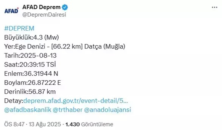 Ege Denizi'nde Muğla'nın Datça ilçesi açıklarında 4.3 büyüklüğünde deprem meydana geldi. Deprem denizin 56.87 kilometre derinliğinde gerçekleşti.