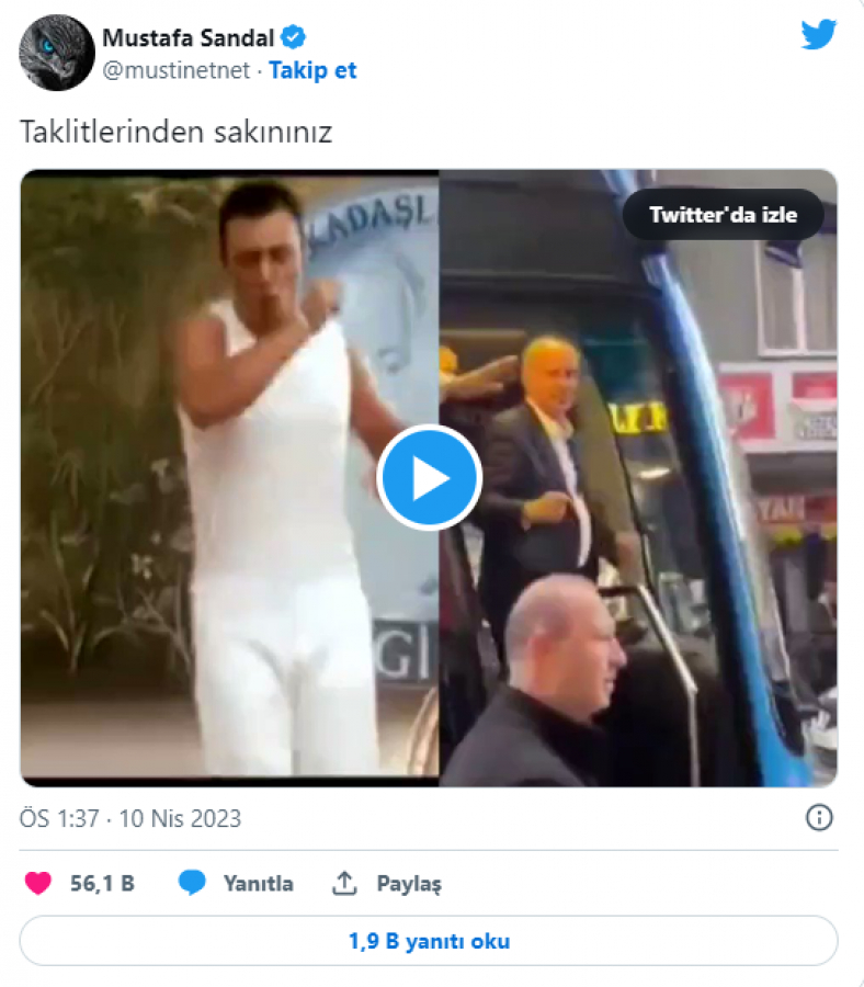 Şarkıcı Mustafa Sandal, sosyal medya hesabından Memleket Partisi lideri Muharrem İnce'nin dansını, kendisinin 'Araba' klibindeki dansıyla karşılaştırarak göndermede bulundu. Sandal, paylaşımında "Taklitlerinden sakınınız" dedi.
