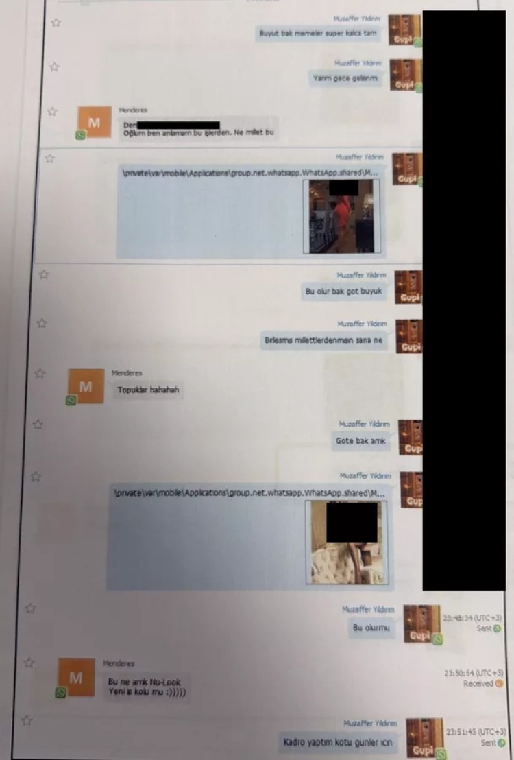 Muzaffer Yıldırım'ın Club House adlı mekanın işletmecisi Menderes Utku ile yaptığı yazışmalar da inceleme kapsamına alındı. Yazışmalarda Yıldırım'ın Utku'ya çok sayıda müstehcen içerikli kadın fotoğrafı gönderdiği belirlendi.