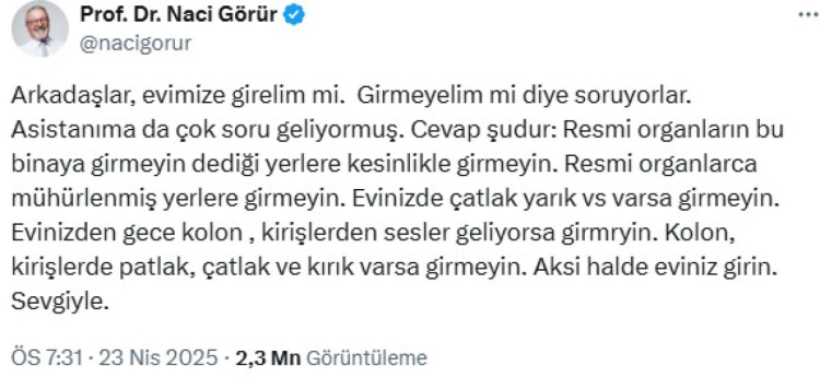 Sosyal medya hesabından "Evlere girelim mi" sorusuna yanıt veren Görür, şunları söyledi: