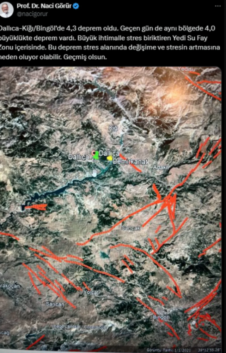 Görür "Büyük ihtimalle stres biriktiren Yedi Su Fay Zonu içerisinde. Bu deprem stres alanında değişime ve stresin artmasına neden oluyor olabilir. Geçmiş olsun." ifadelerini kullandı.