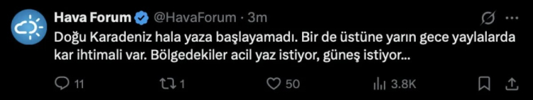 X hesabından yaptığı paylaşımda, "Doğu Karadeniz hala yaza başlayamadı. Bir de üstüne yarın gece yaylalarda kar ihtimali var. Bölgedekiler acil yaz istiyor, güneş istiyor..." ifadelerini kullandı.