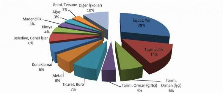 İnşaat, Yol işkolunda 45 işçi; Taşımacılık işkolunda 22 işçi; Tarım, Orman işkolunda 16 emekçi (10 işçi ve 6 çiftçi); Ticaret, Büro, Eğitim, Sinema işkolunda 11 işçi; Metal işkolunda 9 işçi; Konaklama, Eğlence işkolunda 9 işçi; Belediye, Genel İşler işkolunda 9 işçi; Petro-Kimya, Lastik işkolunda 6 işçi; Madencilik işkolunda 5 işçi; Ağaç, Kağıt işkolunda 5 işçi; Gemi, Tersane, Deniz, Liman işkolunda 5 işçi; Sağlık, Sosyal Hizmetler işkolunda 4 işçi; Gıda, Şeker işkolunda 2 işçi; Tekstil, Deri işkolunda 2 işçi; Enerji işkolunda 2 işçi; Savunma, Güvenlik işkolunda 1 işçi; elimizdeki veriler ışığında çalıştığı işkolunu belirleyemediğimiz 5 işçi hayatını kaybetti.