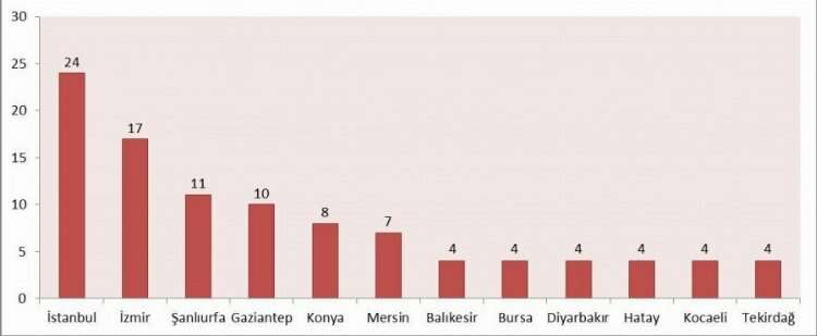 24 ölüm İstanbul'da; 17 ölüm İzmir'de; 11 ölüm Şanlıurfa'da; 10 ölüm Gaziantep'te; 8 ölüm Konya'da; 7 ölüm Mersin'de; 4'er ölüm Balıkesir, Bursa, Diyarbakır, Hatay, Kocaeli ve Tekirdağ'da; 3'er ölüm Adana, Afyon, Kahramanmaraş, Kayseri, Manisa, Mardin ve Sakarya'da; 2'şer ölüm Aksaray, Bartın, Bolu, Denizli, Elazığ ve Sinop'ta; 1'er ölüm Ağrı, Amasya, Ankara, Çorum, Eskişehir, Karabük, Karaman, Kars, Kastamonu, Kütahya, Malatya, Muğla, Niğde, Osmaniye, Rize, Sivas, Uşak, Azerbaycan, Bulgaristan, Gana, Rusya, Senegal, Sırbistan ve Yunanistan'da meydana geldi.