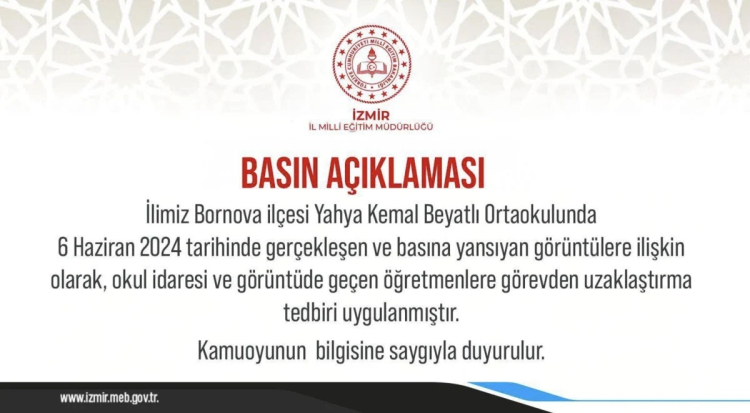 İlimiz Bornova ilçesi Yahya Kemal Beyatlı Ortaokulunda 6 Haziran 2024 tarihinde gerçekleşen ve basına yansıyan görüntülere ilişkin olarak, okul idaresi ve görüntüde geçen öğretmenlere görevden uzaklaştırma tedbiri uygulanmıştır.