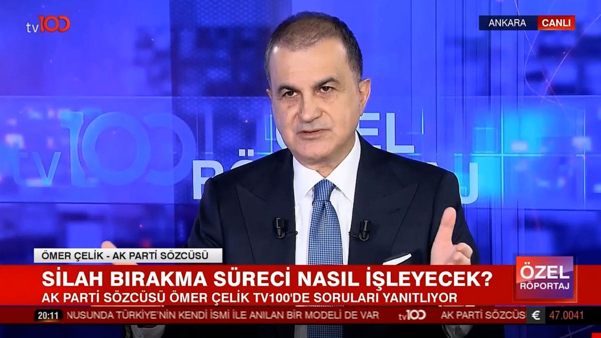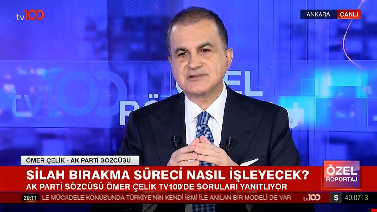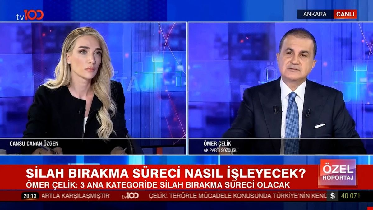 Mayıs ayında kendisini feshetme kararı alan PKK’nın silah bırakmaya hazırlanmasıyla önemli bir aşamaya evrilen ‘Terörsüz Türkiye’ sürecinde, ilk grubun silahlarını yarın bırakması bekleniyor.Adım adım terörsüz Türkiye inşası sürerken AK Parti Sözcüsü Ömer Çelik, katıldığı tv100'de Cansu Canan Özgen’in sunduğu Özel Röportaj programında 'PKK’nın silah bırakma sürecine' ilişkin merak edilen soruları yanıtladı.