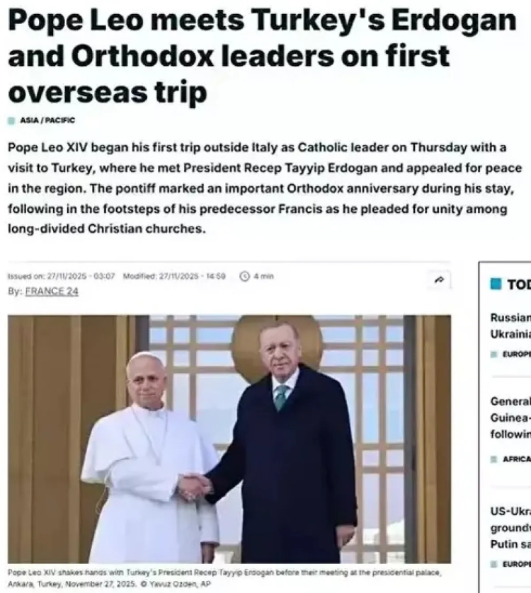 İlk yurt dışı ziyaretini Türkiye'ye yapan Papa 14. Leo'nun Cumhurbaşkanı Recep Tayyip Erdoğan'la görüşmesinin ardından yaptığı açıklamada Erdoğan'a 'istikrar kaynağı' olarak rol üstlenmesi çağrısında bulunması dünya basınında gündeme oturdu.