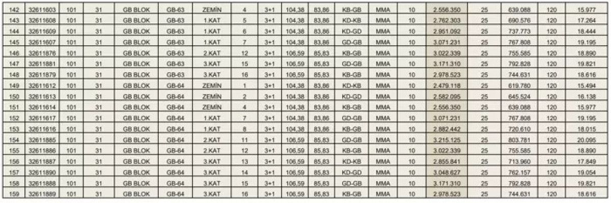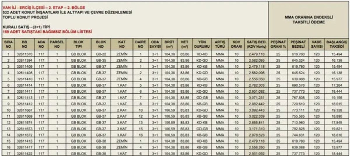 Van’ın Erciş ilçesinde hayata geçirilen 2. Etap 2. Bölge konut projesi kapsamında, Orta gelir grubuna yönelik toplam 159 adet 3+1 daireyi satışa sundu.Satışa sunulan konutlar, teslime hazır olarak alıcısını bekliyor. Açıklamaya göre en uygun 3+1 daire için 585.454 TL peşinat ödeyen vatandaşlar, 120 ay vade ve 14.636 TL taksitlerle ev sahibi olabilecek.Başvurular 10 Haziran 2025 tarihinde başladı ve 20 Haziran 2025’e kadar devam edecek. Kura çekimi ise 25 Haziran 2025 saat 11.30’da TOKİ Hizmet Binası’nda noter huzurunda, seyircisiz olarak gerçekleştirilecek. Çekiliş, TOKİ’nin resmi YouTube kanalı üzerinden canlı olarak yayınlanacak.Kurada asil hak sahipleri için sözleşme imzalama süreci 1 Temmuz - 11 Temmuz 2025 tarihleri arasında gerçekleşecek. Yedek hak sahipleri ise 21 Temmuz - 25 Temmuz 2025 tarihleri arasında sözleşmelerini imzalayabilecek.İşte Van ilinde satılacak konut listesi: