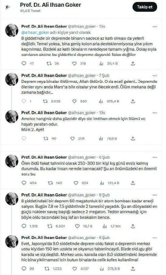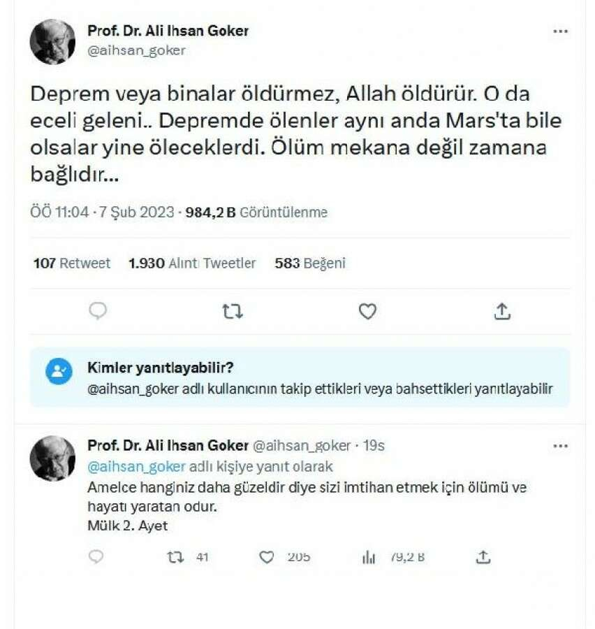 Bilecik Şeyh Edebali Üniversitesi Fen Fakültesi Fizik Bölümü Öğretim Üyesi Prof. Dr. Ali İhsan Göker, Kahramanmaraş merkezli 10 şehirde yıkıma neden olan 2 büyük depremin ardından sosyal medya hesabından paylaşımlarda bulundu. Prof. Dr. Göker, "Deprem veya binalar öldürmez, Allah öldürür. O da eceli geleni. Depremde ölenler aynı anda Mars'ta bile olsalar yine öleceklerdi. Ölüm mekana değil zamana bağlıdır" ifadelerini kullandı.