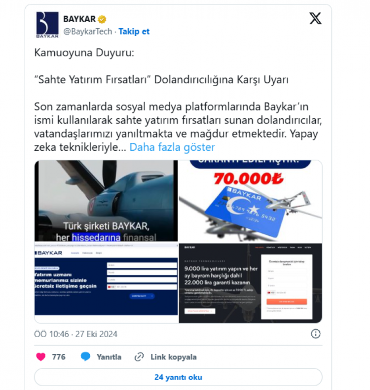 Baykar, şirketin ismi kullanılarak yapılan yatırım çağrılarına itibar edilmemesi gerektiğini, dolandırıcılığı amaçlayan bu tür sahte reklam ve haberlerin tamamen gerçek dışı olduğunu bildirdi.
