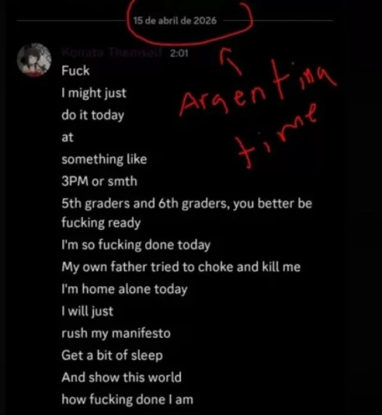 İddialara göre, saldırganın Discord adlı mesajlaşma uygulamasında yer alan yazışmalarında okulu silahla basacağını ve bir katliam gerçekleştireceğini ifade ettiği belirlendi. Mesajlarında saldırının saatine kadar detay verdiği öne sürüldü. Yazışmalarda "Bunu bugün yapabilirim", "Öğleden sonra 3 ya da o sıralarda" ve "Bu dünyaya ne kadar tükendiğimi göstereceğim" gibi ifadelerin yer aldığı görüldü.