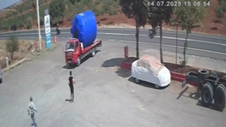 Şanlıurfa'da akaryakıt istasyonunda el freni çekilmeyen çekicinin hareket ettiği ve pompacının hızlı refleksi ile muhtemel bir facianın önüne geçilen anlar güvenlik kamerasına yansıdı.