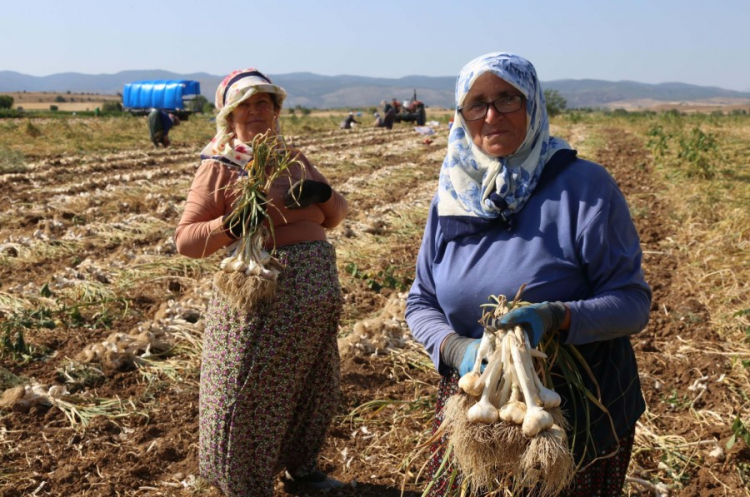 Sarımsak tarlasında çalışan Hacer Topçu ise, "Arkadaşlarla beraber sarımsak çıkartmaya geliyoruz. Havalar biraz sıcak ama alışkınız. Bizi çok etkilemiyor. 15 senedir bu işi yapıyorum. Daha önce de köyde yaşarken de bu işi yapıyordum. Başkanımızla geliyoruz, yevmiye hesabıyla çalışıyoruz. Yevmiyelerimiz bin 200 lira oldu.