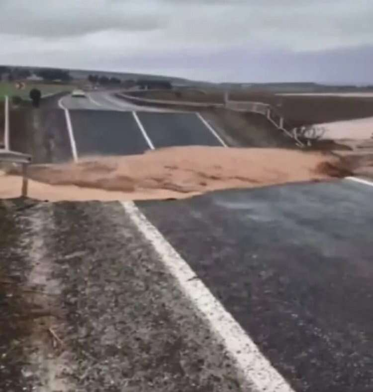 Tüyler ürperten görüntüde, kara yolunun sel sularına kapıldığı anlar yer aldı.