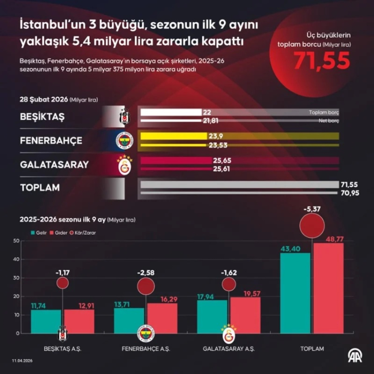 Böylece üç büyükler, bu sezonun 1 Haziran 2025 -28 Şubat 2026 arasını kapsayan ilk 9 ayını, 5 milyar 375 milyon liralık zararla kapattı.