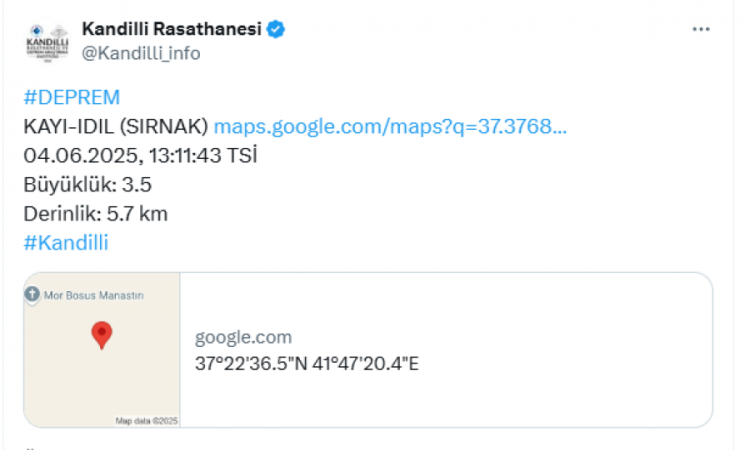 Kandilli Rasathanesi'nden alınan verilere göre Şırnak'ta 3.5 büyüklüğünde bir deprem meydana geldi. Deprem sonrası herhangi olumsuz bir duruma rastlanmadı.