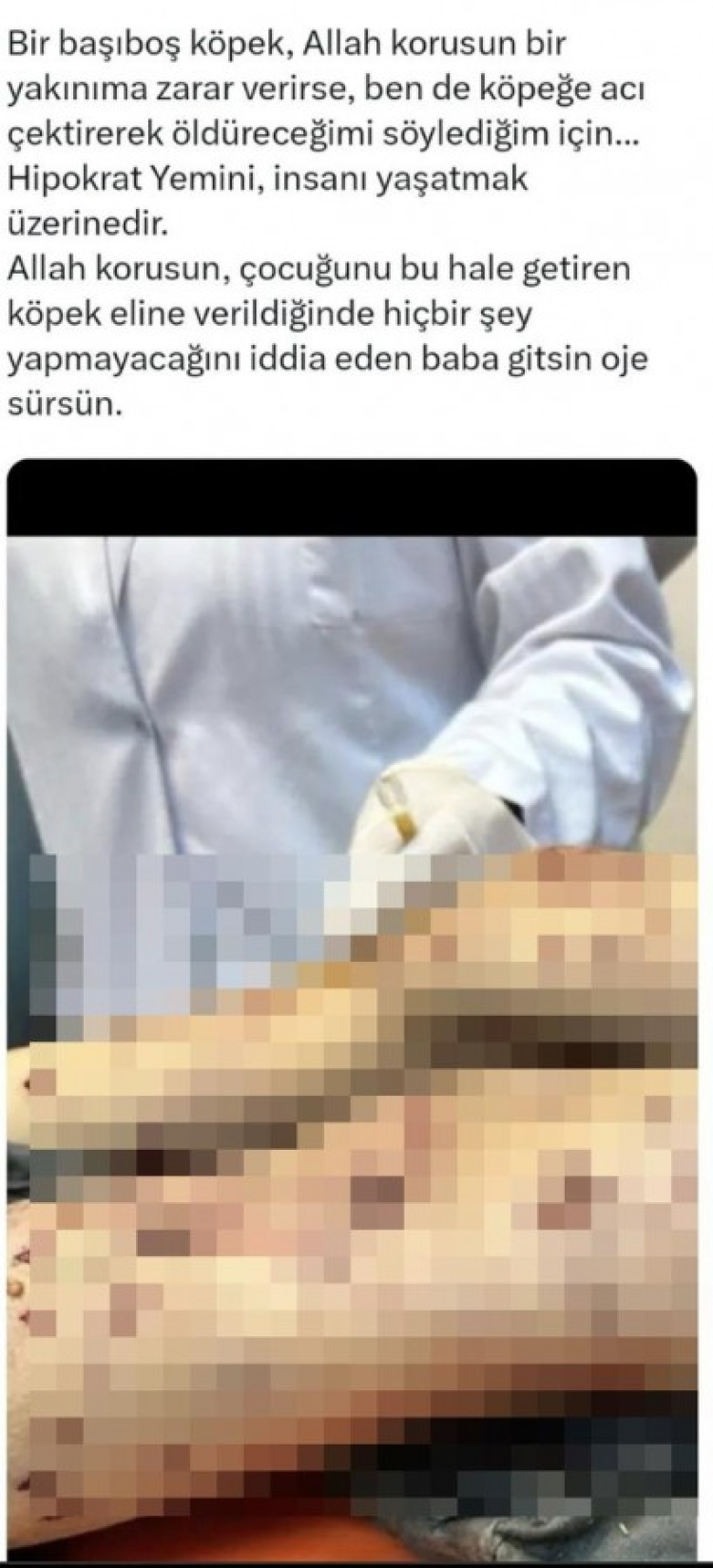 Açıklamaların devamında daha da ilginç ifadeler kullanan Taşbaş köpekler tarafından saldırıya uğramış bir kişinin fotoğrafını paylaşarak üstüne, "Hipoktat yemini insanı yaşatmak üzerinedir. Allah korusun çocuğunu bu hale getiren köpek eline verildiğinde hiçbir şey yapmayacağını iddia eden baba gitsin oje sürsün" notunu düştü.