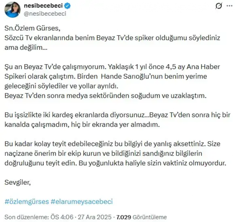 Cebeci, sosyal medya hesabından yaptığı açıklamada şu ifadelere yer verdi: "Sn.Özlem Gürses, Sözcü Tv ekranlarında benim Beyaz Tv'de spiker olduğumu söylediniz ama değilim...