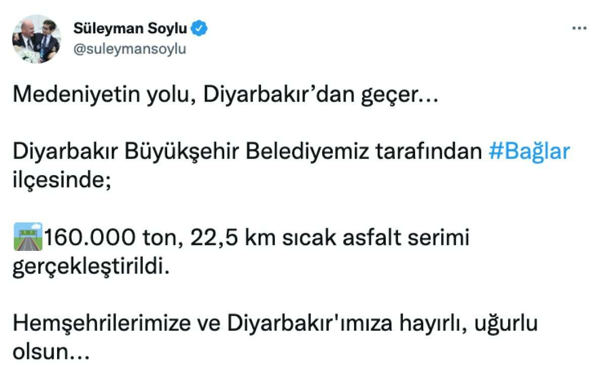 "Medeniyetin yolu, Diyarbakır’dan geçer... Diyarbakır Büyükşehir Belediyemiz tarafından #Bağlar ilçesinde; 160.000 ton, 22,5 km sıcak asfalt serimi gerçekleştirildi. Hemşehrilerimize ve Diyarbakır'ımıza hayırlı, uğurlu olsun..."