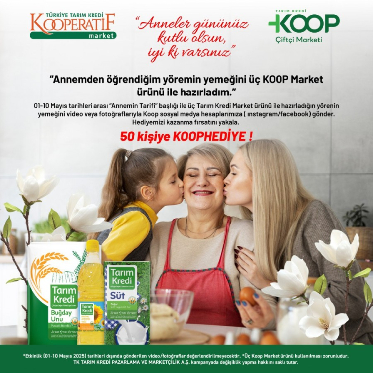 Tarım Kredi Kooperatif Market, Anneler Günü özelinde hediyeleşmek amacıyla yeni kampanyasını duyurdu. Bu kampanyada, 3 KOOP market ürünü ile yemek yapılması ve sosyal medyaya atılması isteniyor. İşte yarışmanın şartları ve detaylar...
