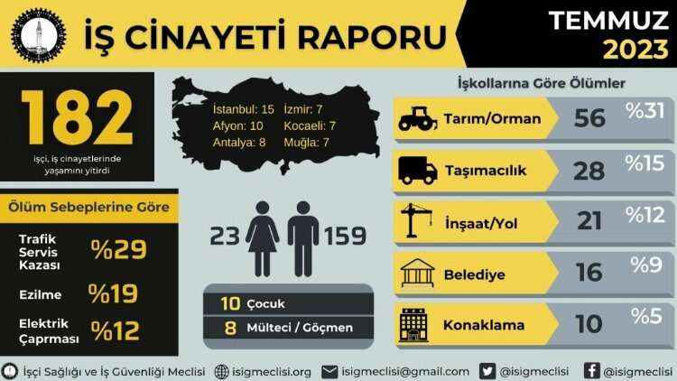 İSİG Meclisi’nin raporuna göre, Temmuz 2023’te en az 182 işçi hayatını kaybetti. Rapora göre, 2023 yılının ilk yedi ayında hayatını kaybeden işçi sayısı ise en az 1051…