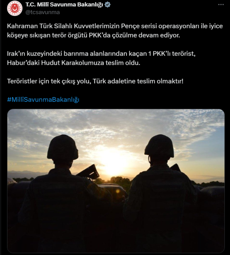 MSB'den yapılan açıklamada şu ifadeler yer aldı: Kahraman Türk Silahlı Kuvvetlerimizin Pençe serisi operasyonları ile iyice köşeye sıkışan terör örgütü PKK'da çözülme devam ediyor. Irak'ın kuzeyindeki barınma alanlarından kaçan 1 PKK'lı terörist, Habur'daki Hudut Karakolumuza teslim oldu. Teröristler için tek çıkış yolu, Türk adaletine teslim olmaktır!