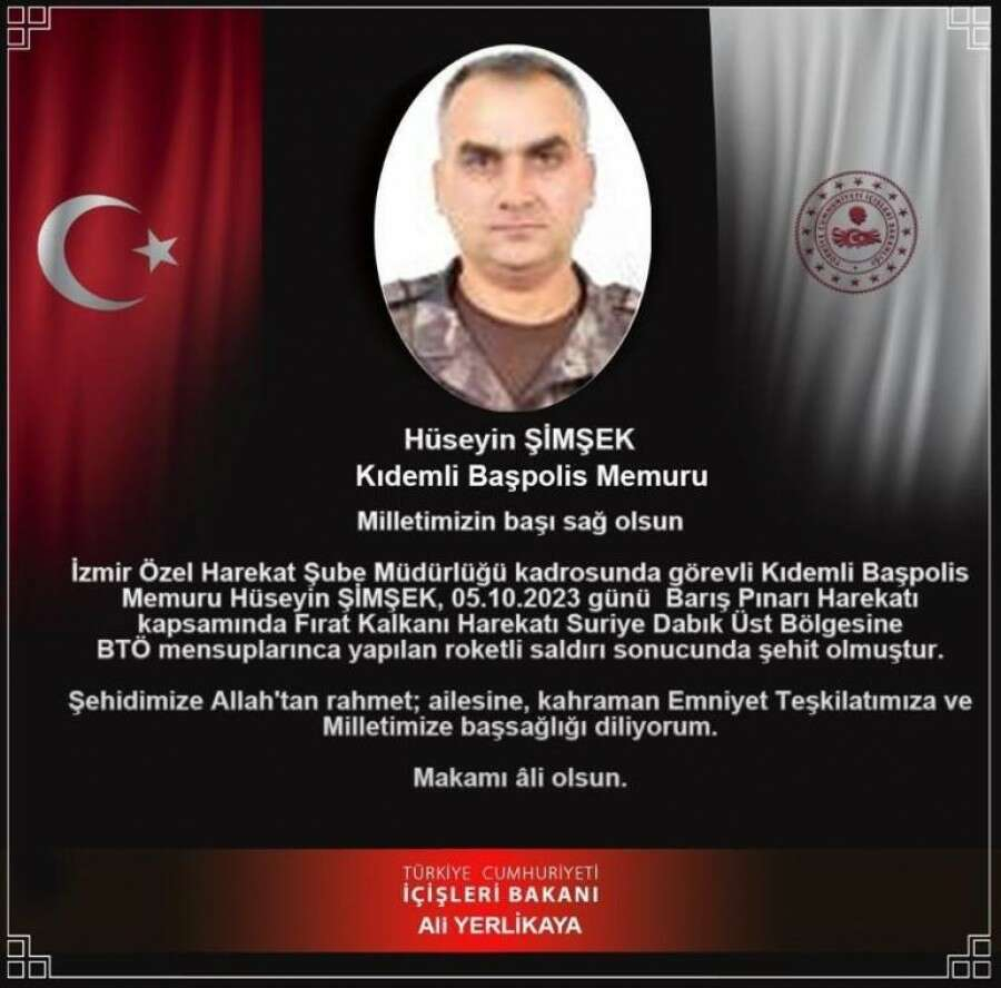 Milletimizin başı sağ olsun. İzmir Özel Harekat Şube Müdürlüğü kadrosunda görevli Kıddem Başpolis Memuru Hüseyin Şimşek, 05.10.2023 günü Barış Pınarı Harekatı kapsamında Fırat Kalkanı Harekatı Suriye Dabık Üst Bölgesine BTÖ mensuplarınca yapılan roketli saldırı sonucunda şehit olmuştur.