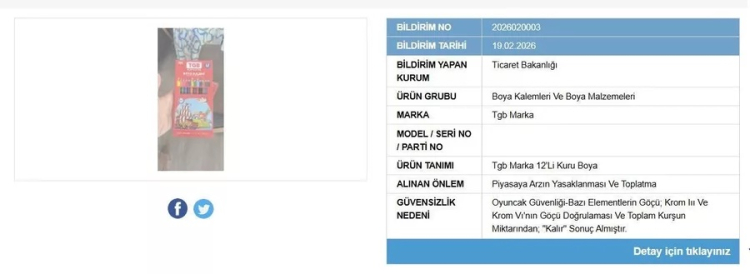 Ticaret Bakanlığı tarafından yürütülen denetim çalışmaları kapsamında Güvensiz Ürün Bilgi Sistemi (GÜBİS) üzerinden yapılan açıklamada bir ürünün kullanıcı sağlığı açısından risk taşıdığı belirtildi.