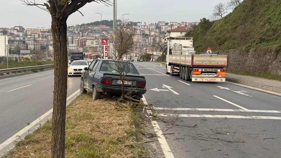 Zonguldak'ın Alaplı ilçesinde meydana gelen trafik kazasında, tırın çarptığı otomobil refüje çıktı. Maddi hasarın oluştuğu kazada yaralanan olmazken, araç içindekiler büyük panik yaşadı.