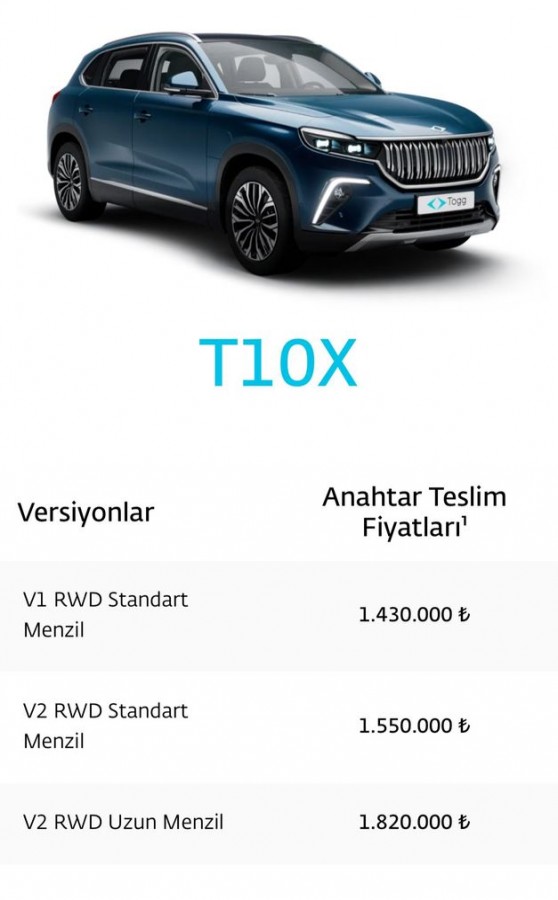 Şirketin yayınladığı yeni fiyat listesine göre, V1 RWD Standart Menzil 1 milyon 227 bin 500 liradan 1 milyon 430 bin liraya, V2 RWD Standart Menzil 1 milyon 329 bin 500 liradan 1 milyon 550 bin liraya ve V2 RWD Uzun Menzil de 1 milyon 563 bin 500 liradan 1 milyon 820 bin liraya yükseldi.