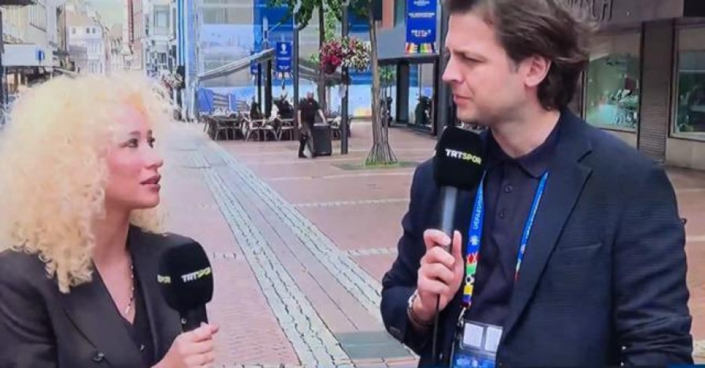 Almanya'daki gazeteciler Ceyla Büyükuzun ve Erbatur Ergenekon TRT Spor canlı yayınında EURO 2024'teki son gelişmeleri aktarırken arka plandan gazetecilerin sesini bastıran ilginç bir sohbet duyuldu.