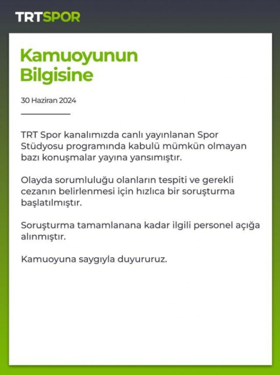 TRT SPOR'DAN AÇIKLAMA: İLGİLİ PERSONEL AÇIĞA ALINDI