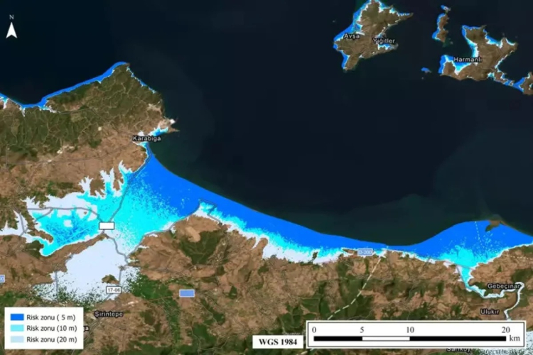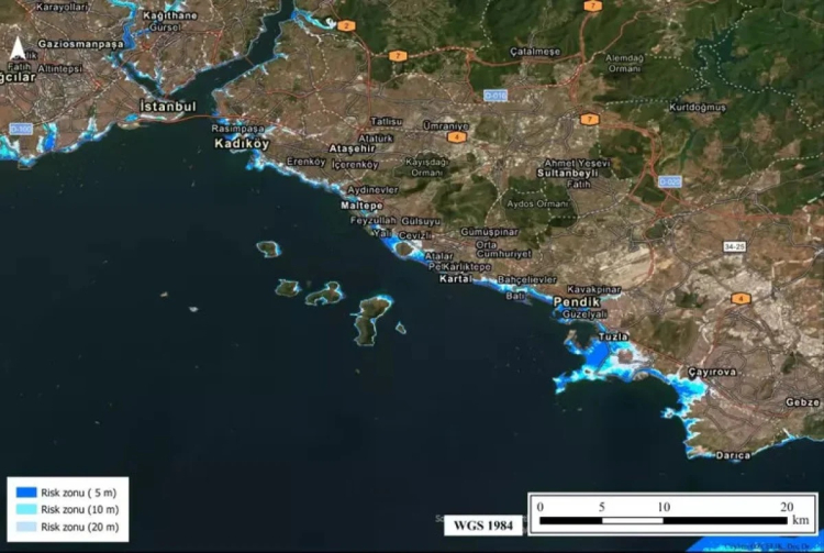 Geliştirilen haritalar, 5, 10 ve 20 metrelik deniz taşkınlarının kıyı bölgelerinde yaratabileceği etkileri ayrıntılı şekilde gösteriyor.