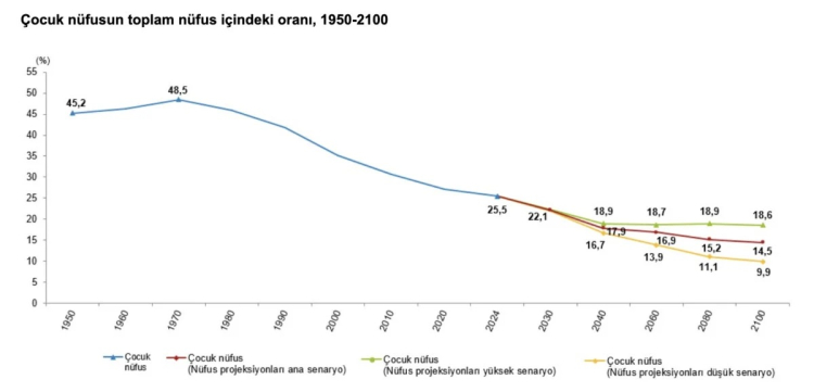 Nüfus projeksiyonlarına göre, çocuk nüfus oranının 2030'da yüzde 22,1, 2040'ta yüzde 17,9, 2060'ta yüzde 16,9, 2080'de yüzde 15,2 ve 2100'de yüzde 14,5 olacağı öngörüldü.