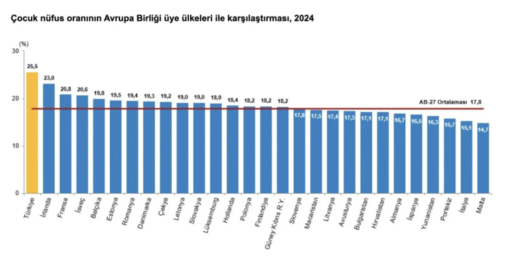 Avrupa Birliği (AB) üyesi 27 ülke incelendiğinde 2024'te çocuk nüfus oranının AB ortalaması yüzde 17,8 oldu.