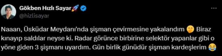 Sayar, uygulamayla karşılaştığı anları sosyal medya hesabından paylaşarak durumu anlattı. Yaptığı paylaşımda "Üsküdar Meydanı'nda şişman çevirmesine yakalandım. Biraz kınayıp saldılar neyse ki. Radar görünce birbirine selektör yapanlar gibi o yöne giden 3 şişmanı uyardım. Gün birlik günüdür şişman kardeşlerim" ifadelerini kullandı." ifadelerini kullandı.