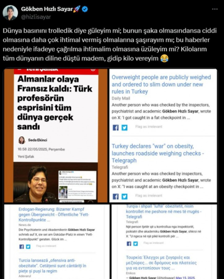 Sağlık Bakanlığı'nın yeni Vücut Kitle Endeksi uygulaması hakkında şaka yapan Prof. Dr. Gökben Hızlı Sayar birçok ülkeye haber konusu oldu. Tüm dünya basını yaptığı şakayı gerçek sandı.