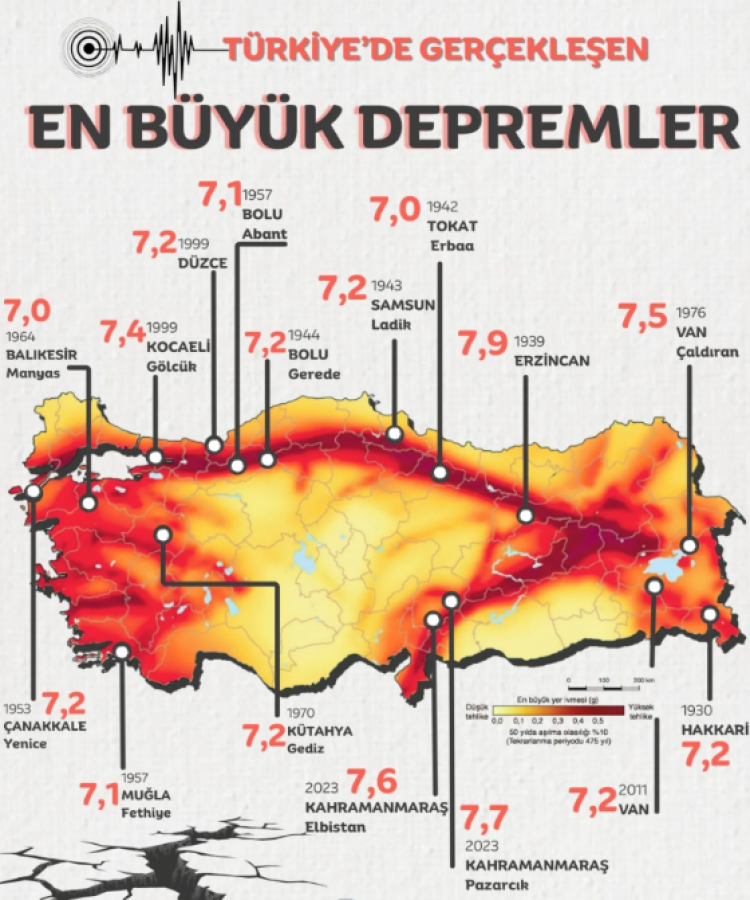 Türkiye'de gerçekleşen en büyük depremler şu şekilde: