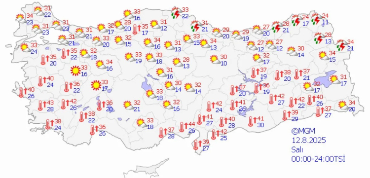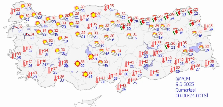 Meteoroloji Genel Müdürlüğü'nün (MGM) 5 günlük hava tahmin haritalarına göre, Türkiye'de 9-13 Ağustos 2025 tarihleri arasında sıcaklıklar mevsim normallerinin üzerinde seyredecek.