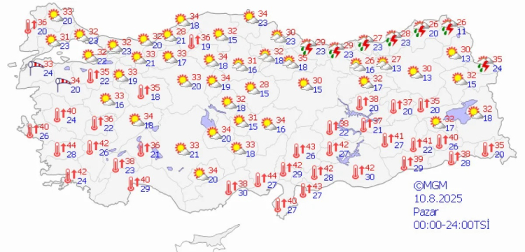 10 Ağustos Pazar gününden itibaren sıcaklıkların kuzey bölgelerde hafif düşüş göstereceği, ancak iç ve güney bölgelerde 35-40 derece bandında devam edeceği öngörülüyor.