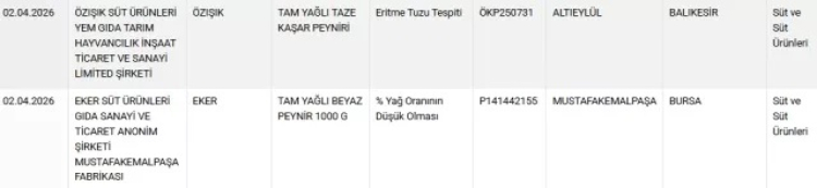 Güncellenen listenin en sarsıcı maddelerinden biri, Türkiye'nin önde gelen ürünleri üreticilerinden Eker Süt Ürünleri ile ilgili oldu. Bursa'nın Mustafakemalpaşa ilçesindeki tesislerde üretilen "Eker Tam Yağlı Beyaz Peynir (1000 g)" üzerinde yapılan analizler, ürünün isminde vadedilen yağ oranını taşımadığını gösterdi. "Tam yağlı" ibaresiyle raflarda yer alan ürünün içeriğinin yasal sınırların altında kalması, firmanın resmi tağşiş listesine girmesine neden oldu.