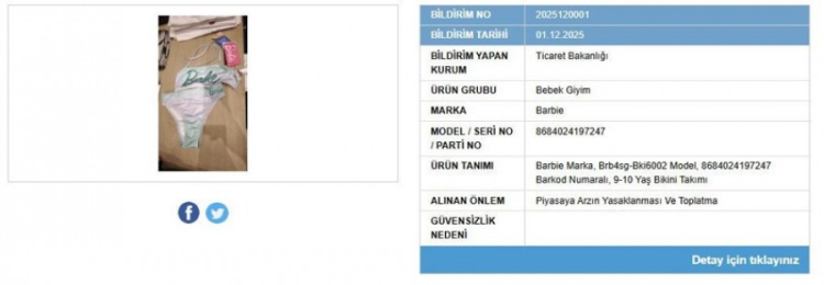Son kontrollerde, Barbie markasına ait bir çocuk giyim ürününün güvenli kullanım şartlarını karşılamadığı belirlendi. Ürünle ilgili yapılan inceleme sonucunda, söz konusu ürünün yasaklanmasına ve piyasadan toplatılmasına karar verildi.